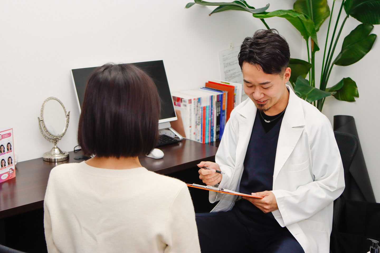 体調や既住症など健康状態を把握するために、カウンセリングシートに必要事項を記入していただきます。また、様々な疑問や不安があればお伺いし、十分なカウンセリングを行います。その後、医師によりアレルギーやお肌の健康状態などの診察を行います。